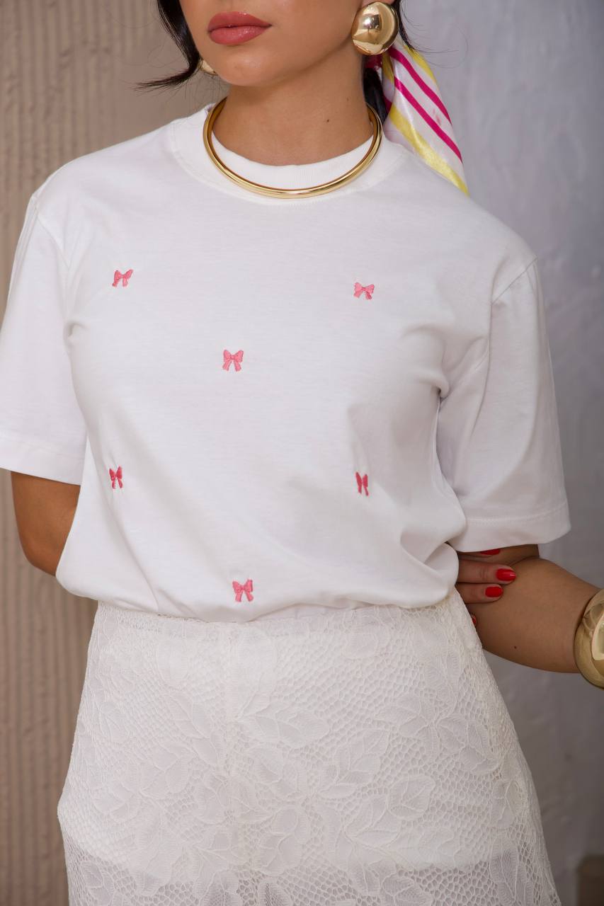 Confeccionada em algodão premium de toque macio e acabamento impecável. Seu design minimalista ganha destaque com bordados delicados em formato de laços distribuídos de forma sutil e estratégica, criando um ar romântico e refinado.